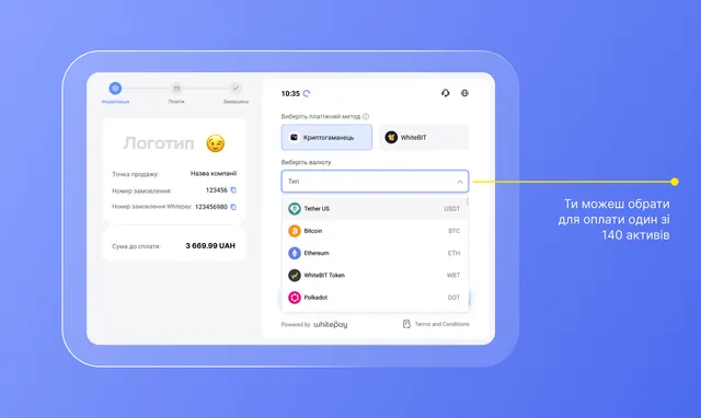 Whitepay надає можливість здійснювати перекази з будь-якого електронного гаманця, використовуючи понад 140 цифрових активів. А також за допомогою застосунку WhiteBIT. Це спрощений процес для клієнтів біржі.
