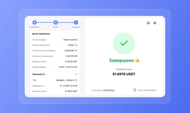 После успешной оплаты система генерирует чек, в котором содержатся данные о переводе: хэш транзакции, сумма и обменный курс.